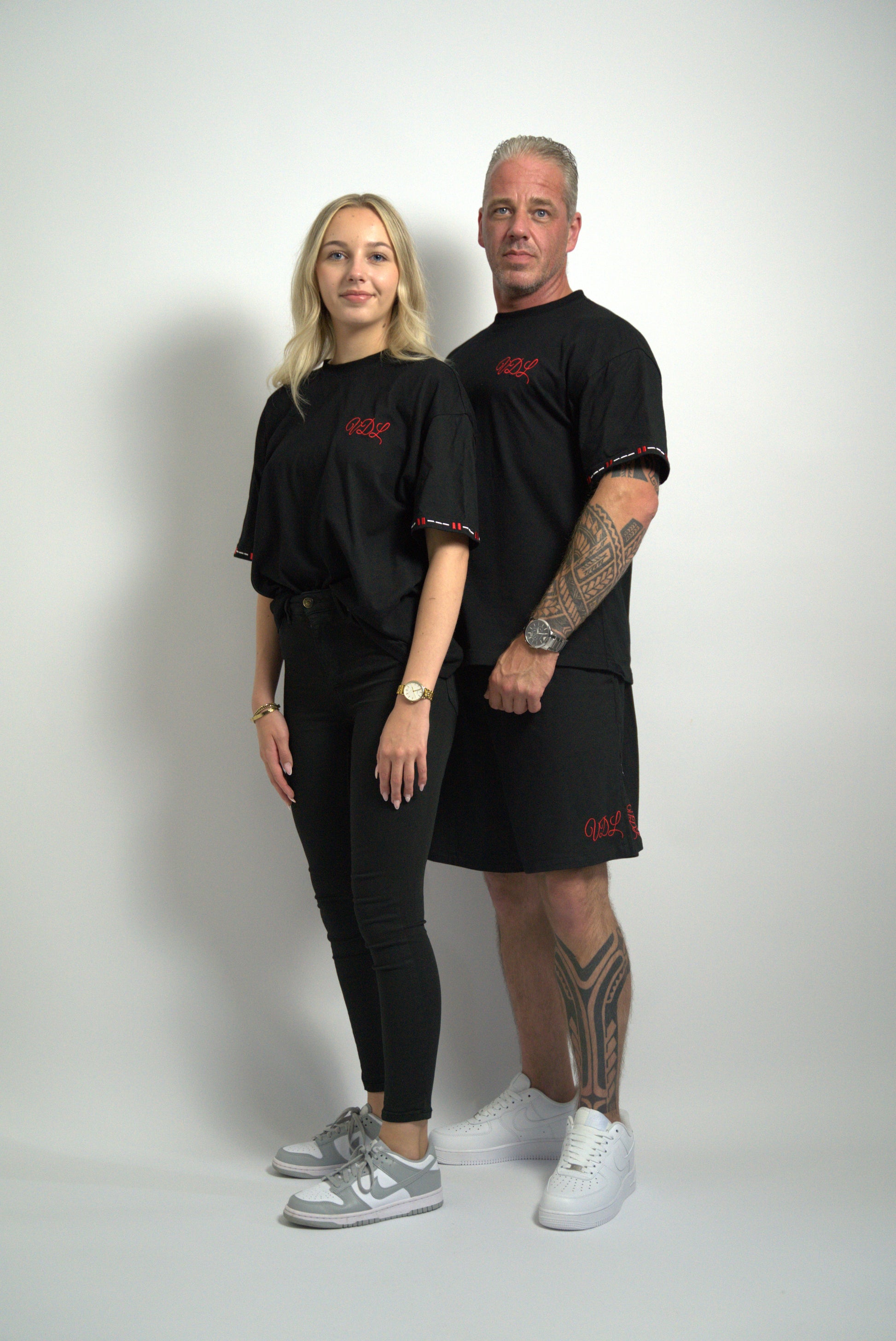 β Oversized uniseks T-shirt met rood geborduurd logo